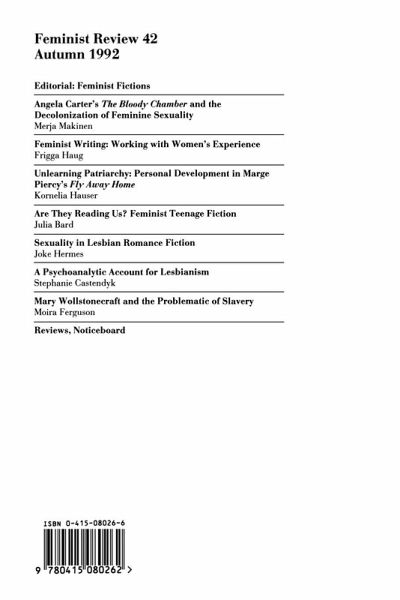Editorial: Feminist Fictions, Angela Carter's `The Bloody Chamber' and the Decolonization of Feminine Sexuality Merja Makinen Feminist Writing: Working with Women's Experience Frigga Haug Three Aspects of Sex Kornelia Hauser Are They Reading Us? Feminist Teenage Fiction Julia Bard Sexuality in Lesbian Romance Fiction Joke Hermes A Psychoanalytic Account for Lesbianism Stephanie Castendyk Mary Wollstonecraft and the Problematic of Slavery Moira Ferguson Plus: Reviews: Women, Islam and the State Nira Yuval-Davis Plotting Women: Women, Gender and Representation in Mexico Carmen Ramos-Escadon The Challenge Road: Women and the Eritrean Revolution Ethel Crowley Sex Exposed: Sexuality and the Pornography Debate Janet Sayers Luce Irigaray: Philosophy and the Feminine Jean Grimshaw The Rites of Man: Love,s ex nd Death in the Making of the Male Gill Allwood Noticeboard and Back Issues