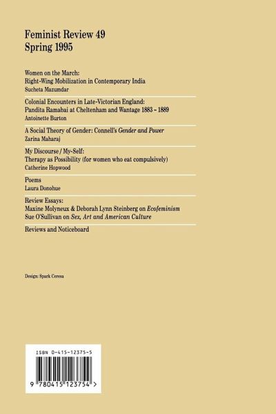 A unique combination of the activist and the academic, Feminist Review has an acclaimed place within women's studies courses and the women's movement. Feminist Review is produced by a London based editorial collective and publishes and reviews work by women; featuring articles on feminist theory, race, class and sexuality, women's history, cultural studies, black and third world feminism, poetry, photography, letters and much more. Feminist Review is available both on subscription and from bookstores. For a Free Sample Copy or further subscription details please contact Terry Sleight, Routledge Subscriptions, ITPS Ltd., Cheriton House, North Way, Andover SP10 5BE, UK.