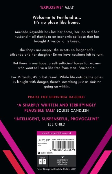 The gripping thriller from the bestselling author of VOX and Q 'A compelling, fast paced read.' Guardian 'The queen of dystopia' Nina Pottell, Prima 'Explosive' Heat 'Provocative, sinister, and fascinating' Stephanie Wrobel, Sunday Times bestselling author of The Recovery of Rose Gold 'Clever and chilling - and all too plausible' Carole Johnstone, author of Mirrorland * * * * * * * * * * * Miranda Reynolds has lost her home, her job and her husband - all thanks to an economic collapse that has brought America to its knees. The shops are empty; the streets no longer safe. Miranda and her daughter Emma have nowhere left to turn. There is one final hope, a self-sufficient haven for women who want to live a life free from men. Femlandia. For Miranda, the secluded Femlandia is a last resort. Life outside the gates is fraught with danger, but there's something just as sinister going on within. Welcome to Femlandia... It's no place like home. * * * * * * * * * * * What readers are saying about FEMLANDIA 'I felt immediately pulled in and intrigued...I cannot wait to see what is going to come next from this author' 'It was completely gripping and I couldn't put it down; absolutely thought provoking' 'A chilling and layered read which I couldn't put down. A true modern horror which exposes the dangers of a world without gender equity and ends with a horrifying sense of circularity.' 'I couldn't stop reading. There were many shocking twists throughout the book and I loved how it flicked between characters and timelines!' 'Well-written, thought provoking and challenging'