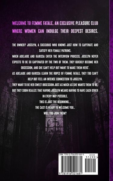 Are you ready to indulge in a world of pure desire? Welcome to Femme Fatale, an exclusive club where women can unleash their deepest fantasies.Meet Josslyn, the alluring succubus who runs the club with an iron fist and knows just how to please her female patrons. But when Adelaide and Karissa enter her world, Josslyn finds herself captivated in a way she never thought possible. These two women quickly become her obsession, and she can't help but want to make them her own.As Adelaide and Karissa delve deeper into the world of Femme Fatale, they, too, can't resist the intense connection they feel with Josslyn. They yearn to be her sweet obsession just as much as she wants them to be. But they soon discover that being with Josslyn means giving themselves over to each other in every way possible. This is just the start of an unforgettable journey where passion, lust, and love collide. Join the cast of Femme Fatale and experience a world where your deepest desires, your wildest fantasies, come to life. Are you ready to surrender to pleasure? If so, the Cast is right outside your bedroom door... ready to serve you the sweetest of pleasures...will you let them in?