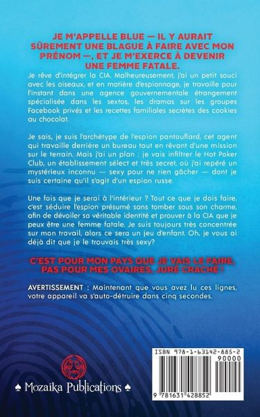 Je m'appelle Blue ‒ il y aurait sûrement une blague à faire avec mon prénom ‒, et je m'exerce à devenir une femme fatale. Je rêve d'intégrer la CIA. Malheureusement, j'ai un petit souci avec les oiseaux, et en matière d'espionnage, je travaille pour l'instant dans une agence gouvernementale étrangement spécialisée dans les sextos, les dramas sur les groupes Facebook privés et les recettes familiales secrètes des cookies au chocolat. Je sais, je suis l'archétype de l'espion pantouflard, cet agent qui travaille derrière un bureau tout en rêvant d'une mission sur le terrain. Mais j'ai un plan: je vais infiltrer le Hot Poker Club, un établissement sélect et très secret, où j'ai repéré un mystérieux inconnu ‒ sexy pour ne rien gâcher ‒ dont je suis certaine qu'il s'agit d'un espion russe. Une fois que je serai à l'intérieur ? Tout ce que je dois faire, c'est séduire l'espion présumé sans tomber sous son charme, afin de dévoiler sa véritable identité et prouver à la CIA que je peux être une femme fatale. Je suis toujours très concentrée sur mon travail, alors ce sera un jeu d'enfant. Oh, je vous ai déjà dit que je le trouvais très sexy ? C'est pour mon pays que je vais le faire, pas pour mes ovaires, juré craché ! AVERTISSEMENT: Maintenant que vous avez lu ces lignes, votre appareil va s'auto-détruire dans cinq secondes. REMARQUE: Ce roman est indépendant de toute série. C'est une comédie romantique pétillante et osée, avec une romance au long cours, une héroïne excentrique obsédée par les films d'espionnage, un présumé Russe à se damner, des histoires d'oiseaux terrifiantes et un tas de débats par textos sur la mignonitude très relative de certains animaux. Si vous n'aimez pas l'un de ces thèmes, alors fuyez le plus vite possible. Sinon, attachez votre ceinture et préparez-vous à des avalanches d'émotions et de rires.