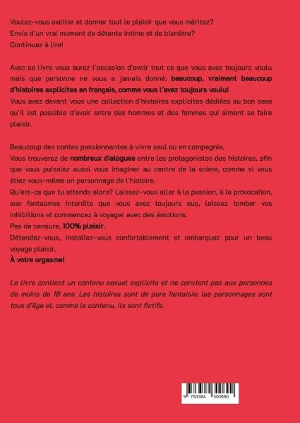 Voulez-vous exciter et donner tout le plaisir que vous méritez?Envie d'un vrai moment de détente intime et de bienêtre?Continuez à lire!Avec ce livre vous aurez l'occasion d'avoir tout ce que vous avez toujours voulu mais que personne ne vous a jamais donné: beaucoup, vraiment beaucoup d'histoires explicites en français, comme vous l'avez toujours voulu!Vous avez devant vous une collection d'histoires explicites dédiées au bon sexe qu'il est possible d'avoir entre des hommes et des femmes qui aiment se faire plaisir. Beaucoup des contes passionnantes à vivre seul ou en compagnie.Vous trouverez de nombreux dialogues entre les protagonistes des histoires, afin que vous puissiez aussi vous imaginer au centre de la scène, comme si vous étiez vous-même un personnage de l'histoire.Qu'est-ce que tu attends alors? Laissez-vous aller à la passion, à la provocation, aux fantasmes interdits que vous avez toujours eus, laissez tomber vos inhibitions et commencez à voyager avec des émotions.Pas de censure, 100 pour 100 de plaisir.Détendez-vous, installez-vous confortablement et embarquez pour un beau voyage plaisir.À votre orgasme!