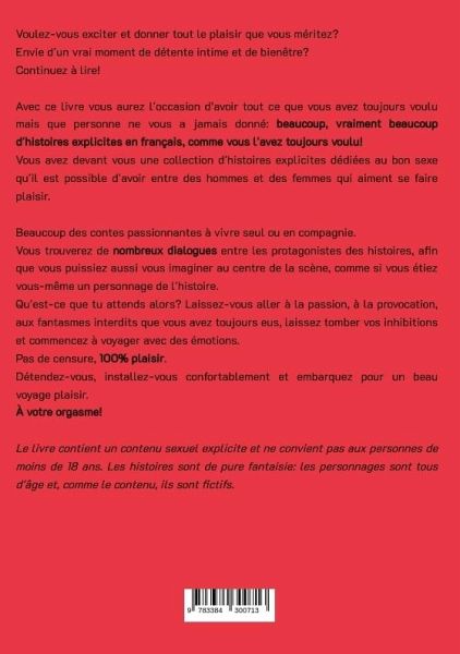 Voulez-vous exciter et donner tout le plaisir que vous méritez?Envie d'un vrai moment de détente intime et de bienêtre?Continuez à lire!Avec ce livre vous aurez l'occasion d'avoir tout ce que vous avez toujours voulu mais que personne ne vous a jamais donné: beaucoup, vraiment beaucoup d'histoires explicites en français, comme vous l'avez toujours voulu!Vous avez devant vous une collection d'histoires explicites dédiées au bon sexe qu'il est possible d'avoir entre des hommes et des femmes qui aiment se faire plaisir. Beaucoup des contes passionnantes à vivre seul ou en compagnie.Vous trouverez de nombreux dialogues entre les protagonistes des histoires, afin que vous puissiez aussi vous imaginer au centre de la scène, comme si vous étiez vous-même un personnage de l'histoire.Qu'est-ce que tu attends alors? Laissez-vous aller à la passion, à la provocation, aux fantasmes interdits que vous avez toujours eus, laissez tomber vos inhibitions et commencez à voyager avec des émotions.Pas de censure, 100 pour 100 de plaisir.Détendez-vous, installez-vous confortablement et embarquez pour un beau voyage plaisir.À votre orgasme!