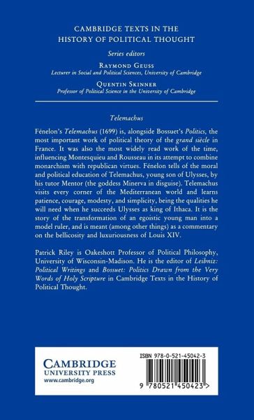 Fénelon's Telemachus (1699) is, alongside Bossuet's Politics, the most important work of political theory of the grand siècle in France. It was also the most widely read work of the time, influencing Montesquieu and Rousseau in its attempt to combine monarchism with republican virtues. Fénelon tells of the moral and political education of Telemachus, young son of Ulysses, by his tutor Mentor (the goddess Minerva in disguise). Telemachus visits every corner of the Mediterranean world and learns patience, courage, modesty and simplicity, the qualities he will need when he succeeds Ulysses as King of Ithaca. It is the story of the transformation of an egoistic young man into a model ruler, and is meant (among other things) as a commentary on the bellicosity and luxuriousness of Louis XIV. The present English edition follows closely that of Tobias Smollett published in 1776.
