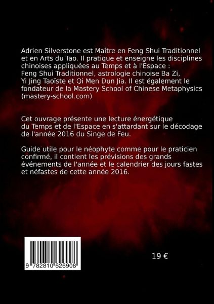 Cet ouvrage présente une lecture énergétique du Temps et de l'Espace en s'attardant sur le décodage de l'année 2016 du Singe de Feu.Guide utile pour le néophyte comme pour le praticien confirmé, il contient les prévisions des grands événements de l'année et le calendrier des jours fastes et néfastes de cette année 2016.