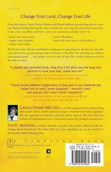 Change Your Look, Change Your Life Feng shui master Carole Swann Meltzer and David Andrusia present feng shui in a new way: Instead of feng shui-ing the space around you, you feng shui your body. Learn how to use color, cut, fabric, and style -- even your accessories and hair color -- to: * jump-start your career * inspire your creativity * ensure your health You'll also learn effective meditation techniques to gain focus in all that you do, plus easy exercises for greater energy than ever before. Feng Shui Chic will help you achieve your greatest goals...and prosper in every part of your life -- today, tomorrow, and in the time to come.