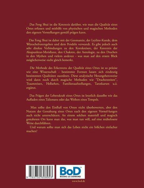 Das Feng Shui ist die Kenntnis darüber, wie man die Qualität eines Ortes erfassen und mithilfe von physischen und magischen Methoden den eigenen Vorstellungen gemäß prägen kann. Das Feng Shui ist daher mit der Geomantie, der Leyline-Kunde, dem Wünschelrutengehen und dem Pendeln verwandt. Es gibt jedoch auch enge und sehr direkte Verbindungen zu den Kornkreisen, der Kenntnis der Akupunktur-Meridiane, den Chakren, der Astrologie, zu den Drachen in den Mythen und vielem anderen - was man auf den ersten Blick möglicherweise nicht gleich bemerkt. Die Methode des Erkennens der Qualität eines Ortes ist so präzise wie eine Wissenschaft - bestimmte Formen lassen sich eindeutig bestimmten Qualitäten zuordnen. Diese analytische Herangehensweise wird dann noch durch magische Methoden wie Traumreisen, Hellsehen, Familienaufstellungen, Tarotkarten u.ä. ergänzt. Das Prägen der Lebenskraft eines Ortes ist letztlich dasselbe wie das Aufladen eines Talismans oder das Weihen eines Tempels. Man sollte den Einfluß von Orten nicht überbewerten, aber den Nutzen der Gestaltung eines Ortes nach den eigenen Vorstellungen auch nicht unterschätzen. An einem solchen materiell und magisch gestalteten Ort kann man das, was man tun will, auf eine mühelose Weise durchführen. Und warum sollte man sich das Leben nicht ein bisschen einfacher machen?