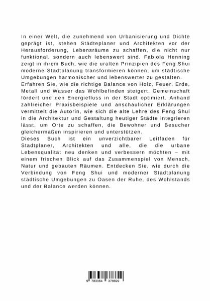 In einer Welt, die zunehmend von Urbanisierung und Dichte geprägt ist, stehen Städteplaner und Architekten vor der Herausforderung, Lebensräume zu schaffen, die nicht nur funktional, sondern auch lebenswert sind. Fabiola Henning zeigt in ihrem Buch, wie die uralten Prinzipien des Feng Shui moderne Stadtplanung transformieren können, um städtische Umgebungen harmonischer und lebenswerter zu gestalten.Erfahren Sie, wie die richtige Balance von Holz, Feuer, Erde, Metall und Wasser das Wohlbefinden steigert, Gemeinschaft fördert und den Energiefluss in der Stadt optimiert. Anhand zahlreicher Praxisbeispiele und anschaulicher Erklärungen vermittelt die Autorin, wie sich die alte Lehre des Feng Shui in die Architektur und Gestaltung heutiger Städte integrieren lässt, um Orte zu schaffen, die Bewohner und Besucher gleichermaßen inspirieren und unterstützen.Dieses Buch ist ein unverzichtbarer Leitfaden für Stadtplaner, Architekten und alle, die die urbane Lebensqualität neu denken und verbessern möchten - mit einem frischen Blick auf das Zusammenspiel von Mensch, Natur und gebauten Räumen. Entdecken Sie, wie durch die Verbindung von Feng Shui und moderner Stadtplanung städtische Umgebungen zu Oasen der Ruhe, des Wohlstands und der Balance werden können.