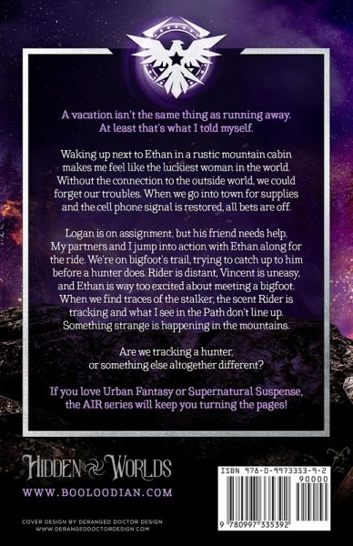A vacation isn't the same thing as running away. At least that's what I told myself. Waking up next to Ethan in a rustic mountain cabin makes me feel like the luckiest woman in the world. Without the connection to the outside world, we could forget our troubles. When we go into town for supplies and cell phone signal is restored, all bets are off. Logan is on assignment, but his friend needs help. My partners and I jump into action with Ethan along for the ride. We're on bigfoot's trail, trying to catch up to him before a hunter does. Rider is distant, Vincent is uneasy, and Ethan is way too excited about meeting a bigfoot. When we find traces of the stalker, the scent Rider is tracking and what I see in the Path don't line up. Something strange is happening in the mountains. Are we tracking a hunter, or something else altogether different? If you love Urban Fantasy or Supernatural Suspense, the AIR series will keep you turning the pages!