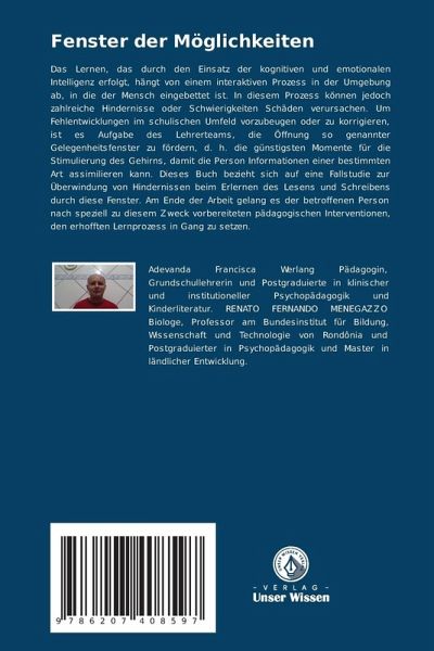 Das Lernen, das durch den Einsatz der kognitiven und emotionalen Intelligenz erfolgt, hängt von einem interaktiven Prozess in der Umgebung ab, in die der Mensch eingebettet ist. In diesem Prozess können jedoch zahlreiche Hindernisse oder Schwierigkeiten Schäden verursachen. Um Fehlentwicklungen im schulischen Umfeld vorzubeugen oder zu korrigieren, ist es Aufgabe des Lehrerteams, die Öffnung so genannter Gelegenheitsfenster zu fördern, d. h. die günstigsten Momente für die Stimulierung des Gehirns, damit die Person Informationen einer bestimmten Art assimilieren kann. Dieses Buch bezieht sich auf eine Fallstudie zur Überwindung von Hindernissen beim Erlernen des Lesens und Schreibens durch diese Fenster. Am Ende der Arbeit gelang es der betroffenen Person nach speziell zu diesem Zweck vorbereiteten pädagogischen Interventionen, den erhofften Lernprozess in Gang zu setzen.
