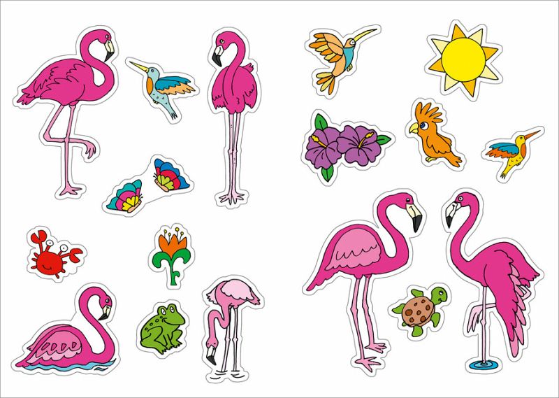 Mit den 30 Fenster-Stickern können die Kinder ihr Fenster in eine rosarote Flamingo-Welt verwandeln. Einfach Oberfläche säubern, Sticker abziehen, mit der glänzenden Seite anbringen und glattstreichen. Die Sticker sind für alle glatten Oberflächen geeignet, rückstandlos ablösbar, wiederverwendbar und an den Fenstern beidseitig sichtbar. Für noch mehr Kreativ-Spaß gibt es zusätzlich 24 zauberhafte Ausmalseiten.
