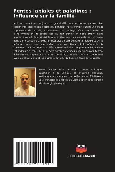 Avoir un enfant est toujours un grand défi pour les futurs parents. Les sentiments sont variés : attentes, bonheur, fierté d'avoir franchi une étape importante de la vie, achèvement du mariage. Ces sentiments se transforment en déception face au fait d'avoir un bébé atteint d'une anomalie congénitale si visible à première vue. Les parents se retrouvent dans un nouveau rôle, avec la nécessité de comprendre la maladie et de se préparer, ainsi que leur enfant, aux opérations, et la nécessité de surmonter tous les obstacles liés à cette maladie. L'impact sur les parents est indéniable, mais seul un petit nombre d'études expérimentales tentent d'évaluer cet impact. Ce livre est dédié aux parents, dont la coopération avec les chirurgiens et les autres membres de l'équipe fente est cruciale.