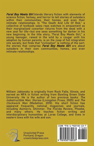 Feral Boy Meets Girl blends literary fiction with elements of science fiction, fantasy, and horror to tell stories of outsiders within their communities, their homes, and even their intimate relationships. In "The Death And Life Of Bob," a collective of textbook sales reps watches in amazement as their marginalized coworker returns from the dead with a new zest for life-but one sees something far darker in his new beginning. In the title story, "Feral Boy Meets Girl," a young teenager, raised in the wild by a cougar until his adoption by human parents, is on the cusp of full integration into society, but finds that "civilization" is nothing of the sort. In "Static," an experimental wormhole leads to a father receiving cell phone calls from his son twenty years in the future-and what he learns about himself isn't pretty. "Minutes of the Pine Valley Residents' Board" features a depressed, cynical secretary observing his condo board becoming a court of star chamber, but as a non-voting member he can only witness and record, rather than intervene. In "The Sound of His Voice," a mother goes to near-superhuman lengths to care for her three-year-old son who has been infected by a zombie virus. And "Do Not Break The Heart Of Charles Nelson Bereiter" offers instructions on how to date an emotionally-broken man literally haunted by a spirit from his past.