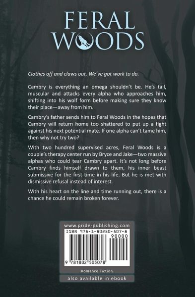 Clothes off and claws out. We've got work to do. Cambry is everything an omega shouldn't be. He's tall, muscular and attacks every alpha who approaches him, shifting into his wolf form before making sure they know their place-away from him. Cambry's father sends him to Feral Woods in the hopes that Cambry will return home too shattered to put up a fight against his next potential mate. If one alpha can't tame him, then why not try two? With two hundred supervised acres, Feral Woods is a couple's therapy center run by Bryce and Jake-two massive alphas who could tear Cambry apart. It's not long before Cambry finds himself drawn to them, his inner beast submissive for the first time in his life. But he is met with dismissive refusal instead of interest. With his heart on the line and time running out, there is a chance he could remain broken forever.
