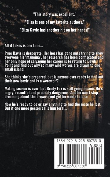 All it takes is one time... Prue Davis is desperate. Her boss has gone nuts trying to show everyone his 'mangina', her research has been confiscated and her only hope of salvaging her career is to return to Devils Point and find out why so many wild wolves are drawn to one small island. She thinks she's prepared, but no one is ever ready to find out their new lover is a werewolf. Mating Season is over, but Brody Fox is still going insane. He's angry, resentful and probably dangerous. And he can't stop dreaming about the brown-eyed girl he wants to bite. Now he's ready to do or say anything to find the mate he lost. But if one more person calls him feral...¿