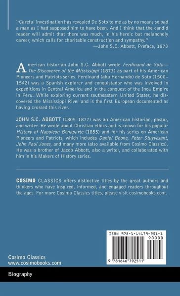 "Careful investigation has revealed De Soto to me as by no means so bad a man as I had supposed him to have been. And I think that the candid reader will admit that there was much, in his heroic but melancholy career, which calls for charitable construction and sympathy." -John S.C. Abbott, Preface, 1873 American historian John S.C. Abbott wrote Ferdinand de Soto-The Discoverer of the Mississippi (1873) as part of his American Pioneers and Patriots series. Ferdinand (aka Hernando) de Soto (1500-1542) was a Spanish explorer and conquistador who was involved in expeditions in Central America and in the conquest of the Inca Empire in Peru. While exploring current southeastern United States, he discovered the Mississippi River and is the first European documented as having crossed this river.