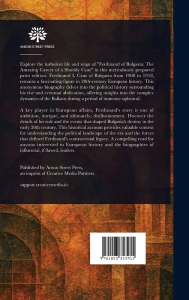 Explore the turbulent life and reign of "Ferdinand of Bulgaria: The Amazing Career of a Shoddy Czar" in this meticulously prepared print edition. Ferdinand I, Czar of Bulgaria from 1908 to 1918, remains a fascinating figure in 20th-century European history. This anonymous biography delves into the political history surrounding his rise and eventual abdication, offering insights into the complex dynamics of the Balkans during a period of immense upheaval. A key player in European affairs, Ferdinand's story is one of ambition, intrigue, and ultimately, disillusionment. Discover the details of…mehr