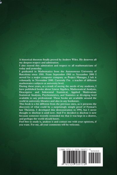 A historical theorem finally proved by Andrew Wiles. He deserves all my deepest respect and admiration. I also extend this admiration and respect to all mathematicians of today and yesterday. I graduated in Mathematics from the Autonomous University of Barcelona since 1988. Currently I'm a teacher of different mathematics subjects at university level. During these years, I have published many books. These books are available around the world in university libraries and also in any bookstore. This book is a bit different from the previous ones, as it presents the discovery of what could be a surprisingly simple proof of Fermat's last Theorem. I developed this demonstration in 1998, but I never thought to disclose it until now. And I've decided to disclose it now because someone recently reminded me that it was kept in a drawer, and perhaps the world should know. Feel free to study it, analyze it and contact me with your opinions, if you want. For me, all your comments will be welcome.