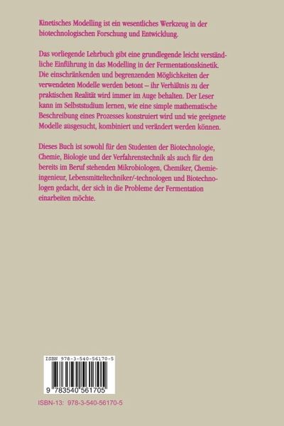 Kinetisches Modelling ist ein wesentliches Werkzeug in der biotechnologischen Forschung und Entwicklung. Die komplexen Systeme, die in einem Reaktionskessel während der Fermenta- tion mittels Zellkulturen entstehen, können unmöglich unter jeder nur denkbaren Kombination von Reaktionsbedingungen ge- testet werden. Hierzu werden das Wissen und die Anwendung der Reaktionskinetik sowie der zugehörigen mathematischen Techniken benötigt. Das vorliegende Lehrbuch gibt eine grundlegende, leicht verständliche Einführung in das Modelling der Fermentationskinetik. Der Leser kann im Selbststudium lernen, wie eine simple mathematische Beschreibung eines Prozesses konstruiert wird und wie geeignete Modelle ausgesucht, kombiniert und verändert werden können.