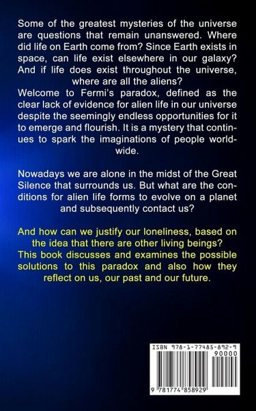 Some of the greatest mysteries of the universe are questions that remain unanswered. Where did life on Earth come from? Since Earth exists in space, can life exist elsewhere in our galaxy? And if life does exist throughout the universe, where are all the aliens? Welcome to Fermi's paradox, defined as the clear lack of evidence for alien life in our universe despite the seemingly endless opportunities for it to emerge and flourish. It is a mystery that continues to spark the imaginations of people worldwide. Nowadays we are alone in the midst of the Great Silence that surrounds us. But what are the conditions for alien life forms to evolve on a planet and subsequently contact us? And how can we justify our loneliness, based on the idea that there are other living beings? This book discusses and examines the possible solutions to this paradox and also how they reflect on us, our past and our future.