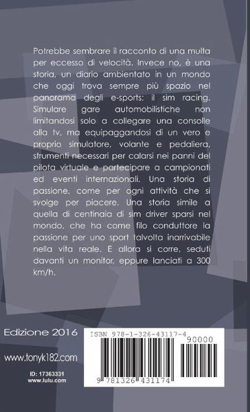 Potrebbe sembrare il racconto di una multa per eccesso di velocità. Invece no, è una storia, un diario ambientato in un mondo che oggi trova sempre più spazio nel panorama degli e-sports: il sim racing. Simulare gare automobilistiche non limitandosi solo a collegare una consolle alla tv, ma equipaggandosi di un vero e proprio simulatore, volante e pedaliera, strumenti necessari per calarsi nei panni del pilota virtuale e partecipare a campionati ed eventi internazionali. Una storia di passione, come per ogni attività che si svolge per piacere. Una storia simile a quella di centinaia di sim driver sparsi nel mondo, che ha come filo conduttore la passione per uno sport talvolta inarrivabile nella vita reale. E allora si corre, seduti davanti un monitor, eppure lanciati a 300 km/h.