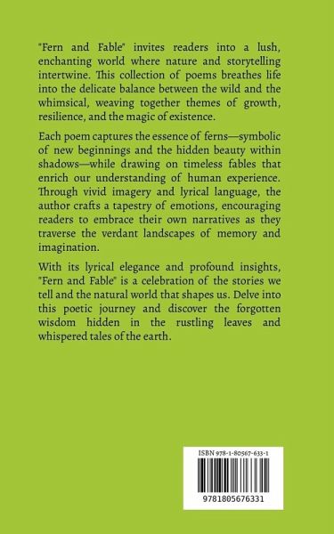 "Fern and Fable" invites readers into a lush, enchanting world where nature and storytelling intertwine. This collection of poems breathes life into the delicate balance between the wild and the whimsical, weaving together themes of growth, resilience, and the magic of existence. Each poem captures the essence of ferns-symbolic of new beginnings and the hidden beauty within shadows-while drawing on timeless fables that enrich our understanding of human experience. Through vivid imagery and lyrical language, the author crafts a tapestry of emotions, encouraging readers to embrace their own narratives as they traverse the verdant landscapes of memory and imagination. With its lyrical elegance and profound insights, "Fern and Fable" is a celebration of the stories we tell and the natural world that shapes us. Delve into this poetic journey and discover the forgotten wisdom hidden in the rustling leaves and whispered tales of the earth.