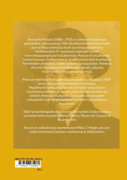 Fernando Pessoa (1888 - 1935) ei omana elinaikanaan paistatellut julkisuudessa. Hän eli pikkuvirkamiehenä melko porvarillista elämää ja kuoli suurempaa huomiota herättämättä 47-vuotiaana maksakirroosiin synnyinkaupungissaan Lissabonissa. Pessoa oli kirjallisessa tuotannossaan multipersoona, syvällä mielessään luomiensa henkilöiden piirittämä, niiden sulauma ja lopputulos. Hänessä yhtyvät kirjailijapersoonallisuudet tavalla, jollaista maailmankirjallisuudessa saa etsiä. Pessoan merkitys Portugalin kirjallisuuden uudistajana 1900-luvun alkuvuosikymmenillä on kiistaton. Maailmankirjallisuutta hänestä on tullut vasta hänen kuolemansa jälkeen, ja hän on ympäri maailmaa lukevan yleisön yhteistä omaisuutta, kun uudet ja taas uudet sukupolvet ovat hänet löytäneet ja hänen tuotantoonsa ihastuneet. Tällä runoantologialla ovat itsensä Fernandon lisäksi mukana tunnetut heteronyymit Alberto Caiero, Álvaro de Campos ja Ricardo Reis. Runot on valikoinut ja suomentanut Miika T. Meijer, joka on myös kirjoittanut teoksen saatesanat ja selitysosion. Runonäytteitä: https://www.miikameijer.com/news/vain-uneni-ovat-vaylia-itseeni-pessoa-kokoelma-2013-