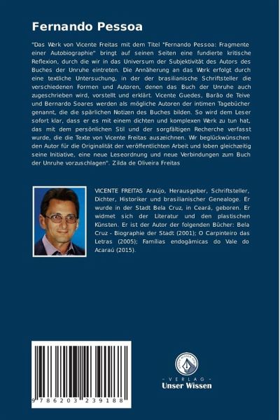 "Das Werk von Vicente Freitas mit dem Titel "Fernando Pessoa: Fragmente einer Autobiographie" bringt auf seinen Seiten eine fundierte kritische Reflexion, durch die wir in das Universum der Subjektivität des Autors des Buches der Unruhe eintreten. Die Annäherung an das Werk erfolgt durch eine textliche Untersuchung, in der der brasilianische Schriftsteller die verschiedenen Formen und Autoren, denen das Buch der Unruhe auch zugeschrieben wird, vorstellt und erklärt. Vicente Guedes, Barão de Teive und Bernardo Soares werden als mögliche Autoren der intimen Tagebücher genannt, die die spärlichen Notizen des Buches bilden. So wird dem Leser sofort klar, dass er es mit einem dichten und komplexen Werk zu tun hat, das mit dem persönlichen Stil und der sorgfältigen Recherche verfasst wurde, die die Texte von Vicente Freitas auszeichnen. Wir beglückwünschen den Autor für die Originalität der veröffentlichten Arbeit und loben gleichzeitig seine Initiative, eine neue Leseordnung und neue Verbindungen zum Buch der Unruhe vorzuschlagen". Zilda de Oliveira Freitas