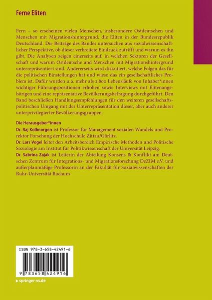 Die Unterrepräsentation von Ostdeutschen und Menschen mit Migrationshintergrund in den Eliten. Eine Einführung.- Positionsauswahl der Elitenstudie 2020 - Sample Report.- Ausmaß und Persistenz personeller Unterrepräsentation in den Eliten Deutschlands.- Bildung und Beruf in der Elitenrekrutierung als Ursache für personelle Unterrepräsentation - die ostdeutsche Bevölkerungsgruppe.- Vergeschlechtlichte Macht. Das (intersektionale) Geschlechterverhältnis in bundesdeutschen Eliten.- "Ich guck mir den Chef an und denke: Was der kann, kann ich auch!" Selbstauskünfte und Karrierebewertungen von Eliteangehörigen.- Eliten und personelle Unterrepräsentation aus Sicht der Bevölkerung - Wahrnehmung, Bewertung, Folgen.- Elitenskepsis im Osten? Befunde einer Distanz.- Wege aus der Unterrepräsentation: Resümee und gesellschaftspolitische Handlungsempfehlungen.