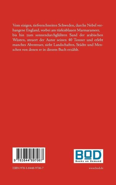 Vom eisigen, tiefverschneiten Schweden, durchs Nebel verhangene England, vorbei am türkisblauen Marmarameer, bis hin zum sonnendurchglühten Sand der arabischen Wüsten, steuert der Autor seinen 40 Tonner und erlebt manches Abenteuer, sieht Landschaften, Städte und Menschen von denen er in diesem Buch erzählt.