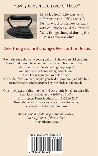 From the time she was a young girl until she was an old grandma, Fern loved Jesus. She served her family and her church gladly. She even had a ministry - hugging people! And her beautiful crocheting, what talent! If you knew Fern, you were fortunate. If you didn't know her, maybe you had a grandma just like her. Read her story and be inspired by her faith and fortitude. Open the pages of this book to find out a little bit about what life was like on a farm in the 1930's and 40's.The story spans Fern's lifetime from 1922 to 2007. Through the good times and the challenging ones, Fern held on to her faith in Jesus.