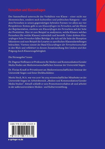 Der Sammelband untersucht das Verhältnis von Klasse - einer nicht nur ökonomischen, sondern auch kulturellen und politischen Kategorie - und dem Fernsehen in seinen gegenwärtigen hybriden Formen vor allem aus vier Perspektiven: Erstens geht es um Klassenfragen im Fernsehen, auf der Ebene der Repräsentation, zweitens um Klassenfragen des Fernsehens auf der Seite der Produktion. Hier ist zum Beispiel zu analysieren, welche Klassen welches Fernsehen (für welche Klassen) entwickelt und herstellt. Unter drittens Klassenfragen beim Fernsehen fallen Beiträge, die sich auf die Seite der Rezeption fokussieren und zum Beispiel die Lesarten zu spezifischen Klassendarstellungen beleuchten. Viertens nimmt der Band Klassenfragen der Fernsehwissenschaft in den Blick und reflektiert in diesem Zusammenhang ihre Lücken und ihre Prägung durch Klassenzugehörigkeit.