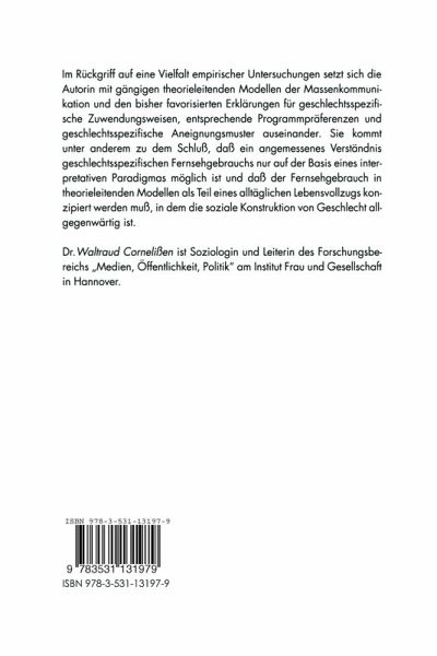 Im Rückgriff auf eine Vielfalt empirischer Untersuchungen setzt sich die Autorin mit den gängigen theorieleitenden Modellen der Massenkommunikation und den bisher favorisierten sozialisationstheoretischen Erklärungen geschlechtsspezifischer Programmpräferenzen und Aneignungsweisen auseinander.