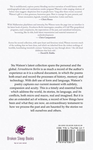Stu Watson's latest collection spans the personal and the global. Fersehturm Berlin is as much a record of the author's experience as it is a cultural document, in which the poems both enact and record the processes of history, memory and technology. With deft use of form and language, Watson's poetry captures our current moment with subtlety, compassion and acuity. This is a timely and essential book which address the world, its stories, its language, and its conflicts, both micro and macro, real and imagined. But it is also an extended act of witness, a record of how things have been and what they are now, an extraordinary testament to how we process the past and are haunted by the stories we tell ourselves and others.