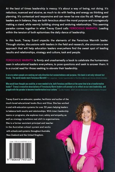 At the best of times leadership is messy. It's about a way of being, not doing. It's nebulous, nuanced and elusive, as much to do with feeling and energy as thinking and planning. It's contextual and responsive and can never be one size fits all. When great leaders are in balance, they are both ferocious about the moral purpose and courageously making a stand, while warmly building strong and enduring relationships. This seeming paradox comes together in what Tracey Ezard calls Ferocious Warmth. Leading within the tension of both epitomises the daily dance of leadership. When you meet a Ferocious Warmth leader, you know it. It is art and science in partnership, a constant flow between the head and the heart and an essential skill for leaders who seek to inspire and transform education. In this book, Tracey Ezard unpacks the elements of the Ferocious Warmth leader. Through stories, discussions with leaders in the field and research, she uncovers a new approach that will help education leaders everywhere find the sweet spot of leading results and relationships, strategy and culture, task and people. Ferocious Warmth is firmly and unashamedly a book to celebrate the humanness seen in educational leaders everywhere, to pose questions and seek to answer them. It is a crucial read for those seeking to elevate their leadership. Through her powerful use of story, Tracey illustrates how leaders in a wide variety of contexts have used the principles and skills of Ferocious Warmth leadership to better the lives of young people and adults working in ever increasingly complex circumstances. In an era where people are seeking not only direction but connectedness and purpose, this book is not only relevant but timely. The world needs more Ferocious Warmth! Piet Langstraat, Former Superintendent of Red Deer, Alberta and Victoria, British Columbia "Ferocious Warmth takes leadership from a theory or capability and gives it life. Ferocious warmth walks the line between conviction and curiosity, between courage and compassion, a line that defines the leadership experience. " Matt Church Author 'Rise Up; an evolution in leadership', Founder Thought Leaders Who would have thought you could be, or even needed to be, both Ferocious and Warm at the same time to be a transformative leader? Tracey's evocative descriptions of Ferociously Warm leaders will prompt us to reflect on our own leadership, and grapple with the paradox to become transformative in our actions." Sue Bell, President, VASSP (Victorian Association of State Secondary Principals) Australia
