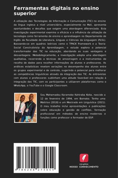 A utilização das Tecnologias de Informação e Comunicação (TIC) no ensino da língua inglesa a nível universitário, especialmente no Mali, apresenta oportunidades e desafios que exigem uma abordagem diferenciada. Esta investigação experimental examina a eficácia e a influência da utilização da tecnologia como ferramenta de ensino e aprendizagem no Departamento de Inglês da Faculdade de Literatura, Línguas e Ciências da Linguagem (FLSL). Baseando-se em quadros teóricos como o TPACK Framework e a Teoria Social Construtivista da Aprendizagem, o estudo explora o potencial transformador das TIC na educação, abordando as suas vantagens e desvantagens. Metodologicamente, a investigação adopta uma abordagem qualitativa, recorrendo a técnicas de amostragem e a instrumentos de recolha de dados para recolher informações de alunos e professores. As análises estatísticas revelam variações no desempenho dos alunos entre os grupos experimental e de controlo, sugerindo o potencial para melhorar as competências linguísticas através da integração das TIC. As entrevistas com alunos e professores sublinham uma atitude favorável em relação à integração das TIC, com os participantes a utilizarem plataformas como o WhatsApp, o YouTube e o Google Classroom.
