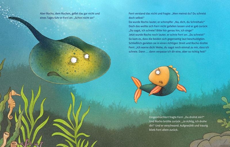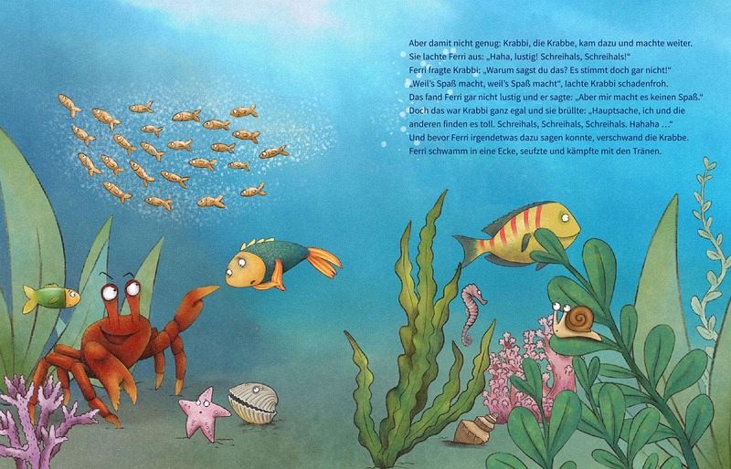 Ferri versteht die Welt nicht mehr: Warum sind plötzlich die anderen Meerestiere gemein zu ihm? Erst wird er beschimpft und dann ausgelacht. Und wenn er sich wehrt, wird alles nur schlimmer. Zuhause sagt er nichts - vielleicht ist ja er selber das Problem? Zum Glück gibt es den klugen Wali. Er erkennt, was los ist, und hilft Ferri und den anderen Meeresbewohnern, einen Weg aus der Situation zu finden.
