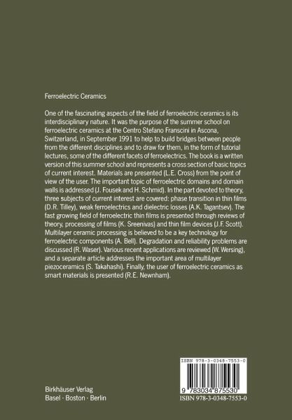 One of the fascinating aspects of the field of ferroelectric ceramics is its interdisciplinary nature. This aspect is also a source of difficulty for the people working in the field. In a successful team of ferroelectricians the physics theoretician must understand the sintering technologist, the electrical engineer has to communicate with the crystallographer, the organic chemist will interact with the microelectronics engineer, the electron microscopist should collaborate with the systems engineer. It was the purpose of the summer school on ferroelectric ceramics that took place at the Centro Stefano Franscini (ETHZ), Monte VeritA, Ascona, Switzerland, in September 1991 to help to build bridges between people from the different disciplines and to draw for them, in the form of tutorial lectures, some of the different facets of ferroelectrics. The book is a written version of this summer school. It contains the following subjects: ferroelectric materials, physics of ferroelectrics, thin films, processing of ferroelectrics and their applications. It represents a cross section of topics of current interest. Materials are presented (L. E. Cross) from the point of view of the user, i. e. the tailoring of materials for specific applications. Two reviews address the important topic of ferroelectric domains and domain walls (I. Fousek and H. Schmid). In the part devoted to theory, three subjects of current interest are presented: phase transition in thin films (D. R. Tilley), weak ferroelectrics (A. K. Tagantsev) and dielectric losses (A. K. Tagantsev).