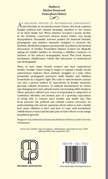 An engaging history of motherhood, demography and infertility in twentieth-century France, this book explores fraught political and cultural meanings attached to the notion of an 'ideal' family size. When statistics revealed a steady decline in the birthrate, concerned citizens feared France was facing depopulation. Pronatalist activists pushed for financial benefits, propaganda and punitive measures designed to increase the birthrate. Motherhood figured prominently in political and medical discussions of fertility. Pronatalists blamed women for allegedly opting for smaller families or choosing a childfree existence, in defiance of the nation's demographic needs. This book situates involuntary childlessness within this discussion of motherhood and demography. Then, as now, many French women and men experienced fertility troubles when trying to begin or expand a family. Fertile expectations explores these intimate struggles at a time when pronatalist propaganda portrayed small families and childless households in a negative light. The early to mid-twentieth century was also a period marked by innovations in fertility medicine, growing cultural awareness of artificial insemination by donor, and changing laws and cultural norms surrounding child adoption. These practices offered new ways of responding to suspected or confirmed infertility and formed part of a growing expectation of being able to control one's fertility and family size. This book presents the political and cultural context necessary for understanding why private questions about when to start a family, how many children to have, and how to cope with involuntary childlessness, evolved and became part of state efforts to encourage population growth.