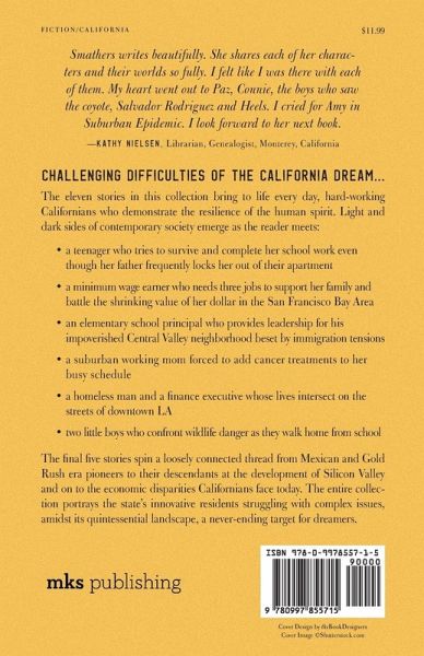 In Fertile Soil: Stories of the California Dream, Mary Smathers presents the light and dark sides of contemporary California, the perseverance of its residents and the richness of its culture across a grand sweep of history. Smathers focuses on those who demonstrate tenacious resilience as they tackle adversity, accepting challenges they could more easily shirk. The characters you'll meet in these pages include: an elementary school principal who provides leadership for his impoverished Central Valley neighborhood a teenager whose father locks her out of her own apartment a minimum wage earner with three jobs who battles the shrinking value of her dollar in the Bay Area a suburban working mom forced to add cancer treatments into her busy schedule a homeless man and a finance whiz whose lives intersect on the streets of downtown LA two little boys who confront wildlife danger on the way home from school Smathers concludes with five intertwined stories, drawing a loosely connected line from Mexican era and Gold Rush pioneers to their descendants at the development of Silicon Valley and on to today. The collection portrays the state's innovative, hard-working residents and quintessential landscape, a never ending target for dreamers.