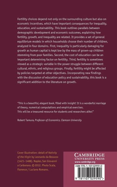 Fertility choices depend not only on the surrounding culture but also on economic incentives, which have important consequences for inequality, education and sustainability. This book outlines parallels between demographic development and economic outcomes, explaining how fertility, growth and inequality are related. It provides a set of general equilibrium models where households choose their number of children, analysed in four domains. First, inequality is particularly damaging for growth as human capital is kept low by the mass of grown-up children stemming from poor families. Second, the cost of education can be an important determining factor on fertility. Third, fertility is sometimes viewed as a strategic variable in the power struggle between different cultural, ethnic and religious groups. Finally, fertility might be affected by policies targeted at other objectives. Incorporating new findings with the discussion of education policy and sustainability, this book is a significant addition to the literature on growth.