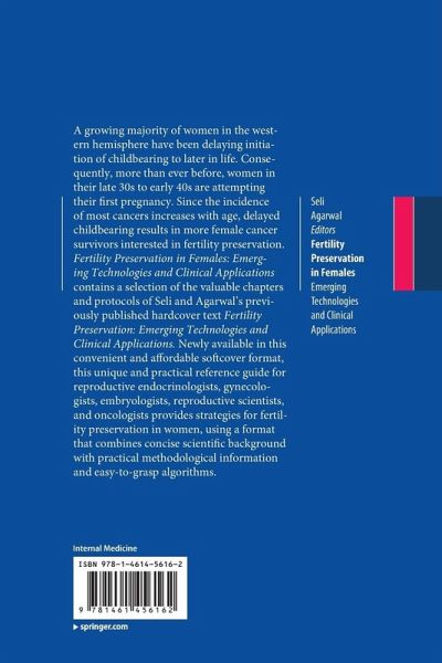 A growing majority of women in the western hemisphere have been delaying initiation of childbearing to later in life. Consequently, more than ever before, women in their late 30s to early 40s are attempting their first pregnancy. Since the incidence of most cancers increases with age, delayed childbearing results in more female cancer survivors interested in fertility preservation . Fertility Preservation in Females: Emerging Technologies and Clinical Applications contains a selection of the valuable chapters and protocols of Seli and Agarwal's previously published hardcover text Fertility Preservation: Emerging Technologies and Clinical Applications . Newly available in this convenient and affordable softcover format, this unique and practical reference guide for reproductive endocrinologists, gynecologists, embryologists, reproductive scientists, and oncologists provides strategies for fertility preservation in women, using a format that combines concise scientific background with practical methodological information and easy-to-grasp algorithms.
