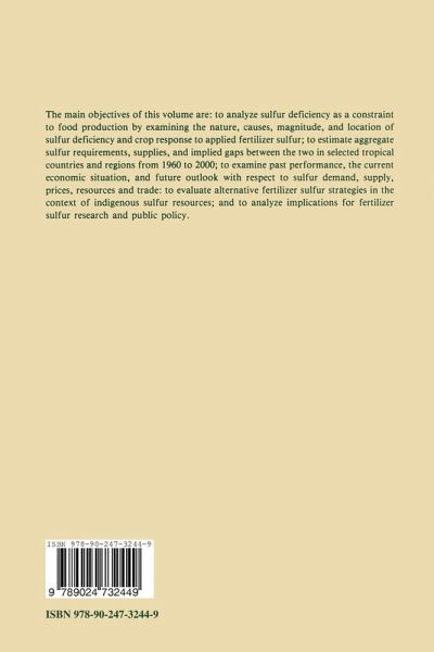 Fertilizer is a vital component of strategies for expanding foodproduction. The rapid growth in population and the widening food deficits inmany tropical countries ofAsia, Africa, and Latin America call attention to those aspects of fertilization that have been neglected but are expected to yield large economic payoffs in the future. Fertilizer sulfur falls into this category. In the past fertilizer sulfur received little attention from researchers and policymakers since sulfur deficiency was not considered a serious problem. It was not a problem because of low crop yields, extensive cropping, and the incidental supply of sulfur through rain, irrigation water, manures, and sulfurcontaining fertilizers. However, the situation has changed in the last three decades. Moder nagriculture based on high crop yields, intensive cropping, improved crop varieties, and greater use of sulfur-free fertilizers and environmental regula tions restricting sulfur emissions are creating large gaps between sulfur sup ply and sulfur requirements. Sulfur deficiencies are widespread and grow ing. Consequently, the full potential of a modern agricultural system in tropical countries is not being realized. This research effort results from the recognition of the seriousness of the sulfur problem and its adverse impact on food production as well as IFDC's dedication to the development and transfer of economically ef ficient fertilizer technology to tropical countries. This study represents a comprehensive analysis ofthe technical and economic linkages between fer tilizer sulfur and food production, and it provides guidelines for future directions in fertilizer sulfur research and public policy.