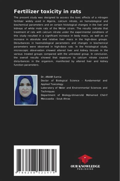 The present study was designed to assess the toxic effects of a nitrogen fertilizer widely used in Algeria, calcium nitrate, on hematological and biochemical parameters and on certain histological changes in the liver and kidneys of white male rats of the Wistar strain. The results indicate that treatment of rats with calcium nitrate under the experimental conditions of this study resulted in a significant increase in body mass, as well as an increase in absolute and relative liver mass in the high-dose groups. Disturbances in haematological parameters and changes in biochemical parameters were observed in high-dose rats. In the histological study, microscopic observation showed altered liver and kidney tissues in the various treated groups compared with the untreated group. In conclusion, the overall results showed that exposure to calcium nitrate caused disturbances in the organism, manifested by altered liver and kidney function parameters.