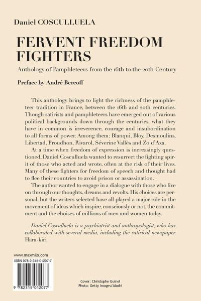 This anthology brings to light the richness of the pamphleteer tradition in France, between the 16th and 20th centuries. Though satirists and pamphleteers have emerged out of various political backgrounds down through the centuries, what they have in common is irreverence, courage and insubordination to all forms of power. Among them: Blanqui, Bloy, Desmoulins, Libertad, Proudhon, Rivarol, Séverine Vallès and Zo d'Axa.At a time when freedom of expression is increasingly questioned, Daniel Cosculluela wanted to resurrect the fighting spirit of those who acted and wrote, often at the risk of their lives. Many of these fighters for freedom of speech and thought had to flee their countries to avoid prison or assassination. The author wanted to engage in a dialogue with those who live on through our thoughts, dreams and revolts. His choices are personal, but the writers selected have all played a major role in the movement of ideas which inspire, consciously or not, the commitment and the choises of millions of men and women today.