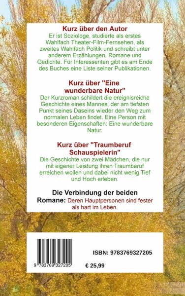 Zwei Kurzromane: Kurz über "Eine wunderbare Natur" Der Kurzroman schildert die ereignisreiche Geschichte eines Mannes, der am tiefsten Punkt seines Daseins wieder den Weg zum normalen Leben findet. Eine Person mit besonderen Eigenschaften: Eine wunderbare Natur. Kurz über "Traumberuf Schauspielerin" Die Geschichte von zwei Mädchen, die nur mit eigener Leistung ihren Traumberuf erreichen wollen und dabei nicht wenig Tief und Hoch erleben. Die Verbindung der beiden Romane: Deren Hauptpersonen sind fester als hart im Leben.