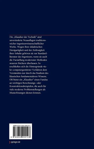 Die "Klassiker der Technik" sind unveränderte Neuauflagen traditionsreicher ingenieurwissenschaftlicher Werke. Wegen ihrer didaktischen Einzigartigkeit und der Zeitlosigkeit ihrer Inhalte gehören sie zur Standardliteratur des Ingenieurs, wenn sie auch die Darstellung modernster Methoden neueren Büchern überlassen. So erschließen sich die Hintergründe vieler computergestützter Verfahren dem Verständnis nur durch das Studium des klassischen fundamentaleren Wissens. Oft bietet ein "Klassiker" einen Fundus an wichtigen Berechnungs- oder Konstruktionsbeispielen, die auch für viele moderne Problemstellungen als Musterlösungen dienen können.