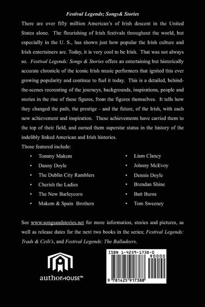 Festival Legends; Songs& Stories There are over fifty million American's of Irish descent in the United States alone. The flourishing of Irish festivals throughout the world, but especially in the U. S., has shown that just how popular the Irish culture and Irish entertainers are. Today, it is very cool to be Irish. That was not always so. Festival Legends: Songs & Stories offers an entertaining but historically accurate chronicle of the iconic Irish music performers that ignited this ever growing popularity and continue to fuel it today. This is a detailed, behind-the-scenes recounting of the journeys, backgrounds, inspirations, people and stories in the rise of these figures, from the figures themselves. It tells how they changed the path, the prestige - and the future, of the Irish, with each new achievement and inspiration. These achievements have carried them to the top of their field, and earned them superstar status in the history of the indelibly linked American and Irish histories. Those featured include: · Tommy Makem · Danny Doyle · The Dublin City Ramblers · Cherish the Ladies · The New Barleycorn · Makem & Spain Brothers · Liam Clancy · Johnny McEvoy