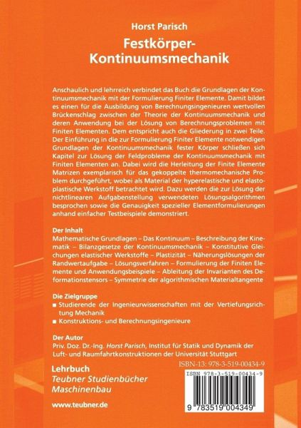Anschaulich und lehrreich verbindet das Buch die Grundlagen der Kontinuumsmechanik mit der Formulierung Finiter Elemente. Damit bildet es einen für die Ausbildung von Berechnungsingenieuren wertvollen Brückenschlag zwischen der Theorie der Kontinuumsmechanik und deren Anwendung bei der Lösung von Berechnungsproblemen mit Finiten Elementen. Dem entspricht auch die Gliederung in zwei Teile. Der Einführung in die zur Formulierung Finiter Elemente notwendigen Grundlagen der Kontinuumsmechanik fester Körper schließen sich Kapitel zur Lösung der Feldprobleme der Kontinuumsmechanik mit Finiten Elementen an. Dabei wird die Herleitung der Finite Elemente Matrizen exemplarisch für das gekoppelte thermomechanische Problem durchgeführt, wobei als Material der hyperelastische und elastoplastische Werkstoff betrachtet wird. Dazu werden die zur Lösung der nichtlinearen Aufgabenstellung verwendeten Lösungsalgorithmen besprochen sowie die Genauigkeit spezieller Elementformulierungen anhand einfacher Testbeispiele demonstriert.