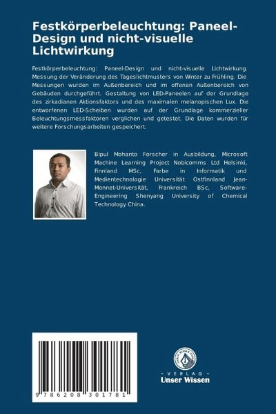 Festkörperbeleuchtung: Paneel-Design und nicht-visuelle Lichtwirkung. Messung der Veränderung des Tageslichtmusters von Winter zu Frühling. Die Messungen wurden im Außenbereich und im offenen Außenbereich von Gebäuden durchgeführt. Gestaltung von LED-Paneelen auf der Grundlage des zirkadianen Aktionsfaktors und des maximalen melanopischen Lux. Die entworfenen LED-Scheiben wurden auf der Grundlage kommerzieller Beleuchtungsmessfaktoren verglichen und getestet. Die Daten wurden für weitere Forschungsarbeiten gespeichert.